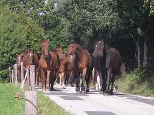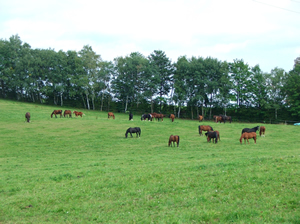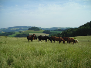 Die Weiden haben eine Größe zwischen 3 und 5ha. In 2 bis 4 Wochen haben die Pferde eine Weide abgefressen. Dann kommen sie auf die nächste und die abgeweidete Fläche wird gepflegt und kann sich erholen. |