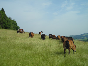 Falls der Hochsommer trotzdem zu heiß oder insektenreich ist, siedelt die Herde für diese Zeit in das Bewegungsstallareal zurück und wird erst gegen Abend auf die umliegenden Weiden gelassen. |